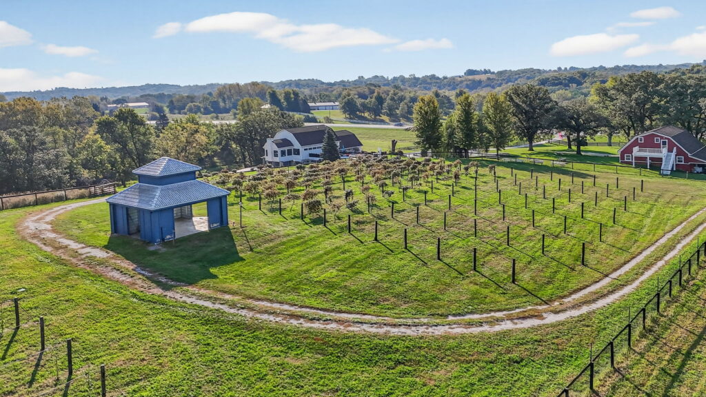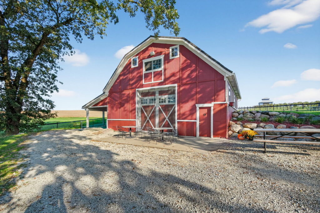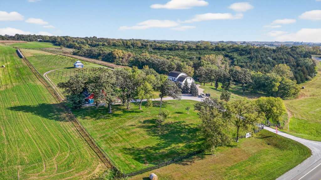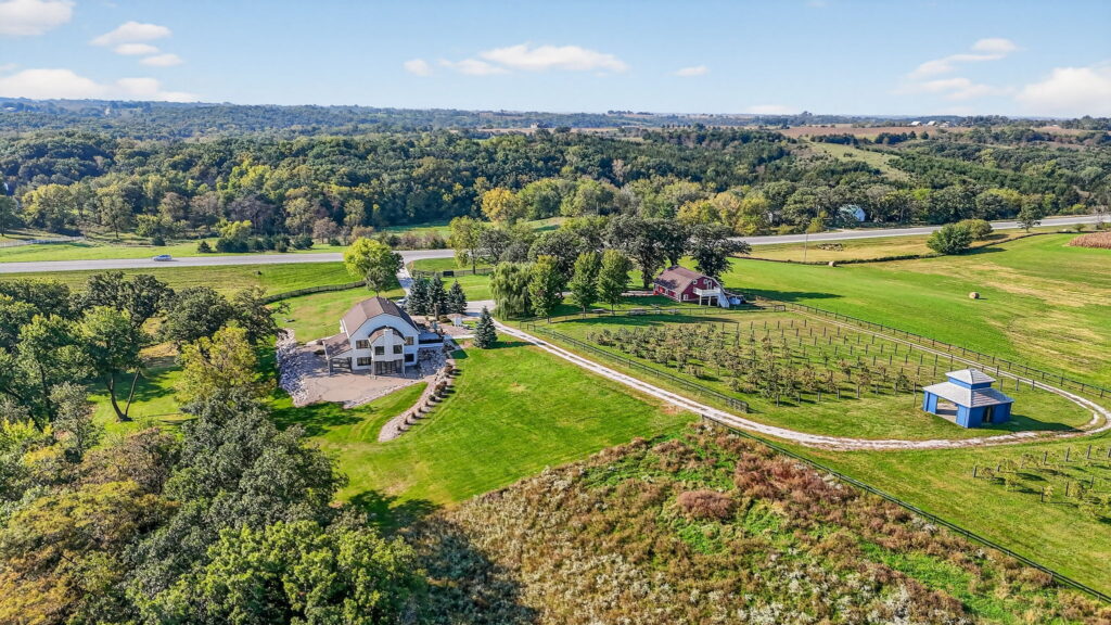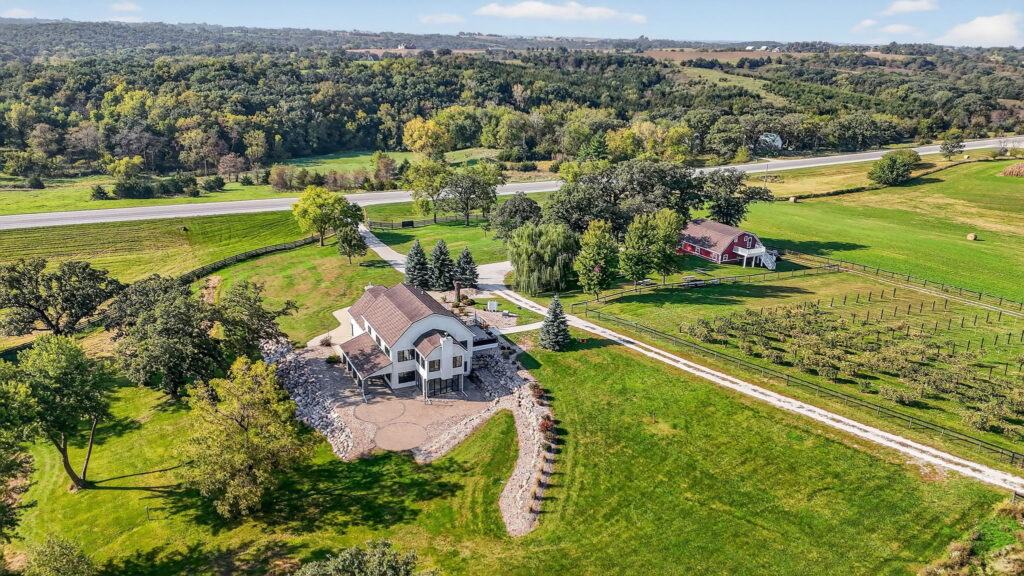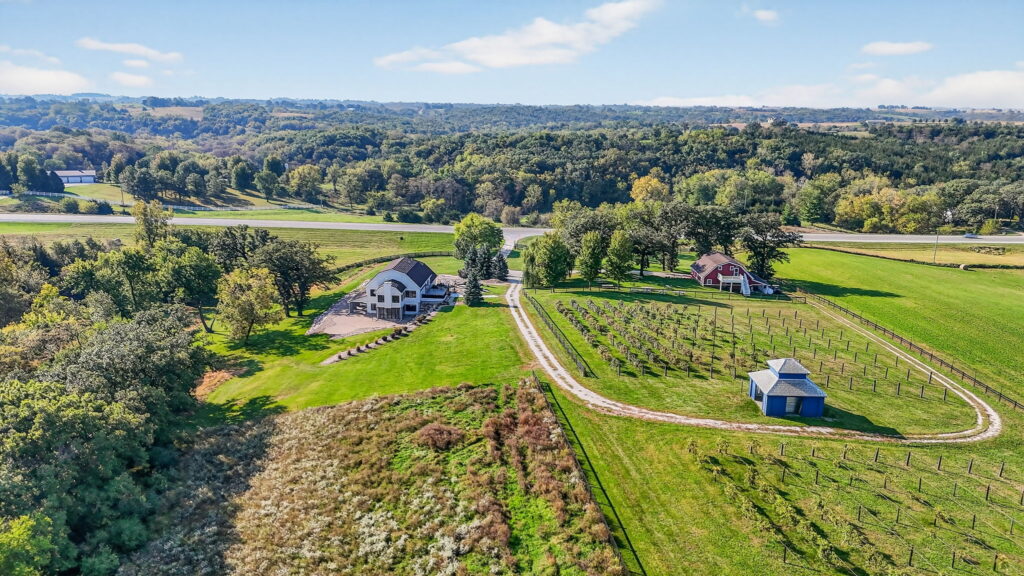 Discover a rare opportunity to own a beautiful executive acreage nestled in the rolling hills of Guthrie County, just on the outer edge of Lake Panorama & only an hour from the Des Moines Metro. This beautifully designed 3,592 SF zero-entry home offers 2 bedrooms, 2 bathrooms, an additional flexible room ideal as a 3rd bedroom or office, & a spacious multi-purpose loft perfect for an extra bedroom, workspace, or storage. The heart of the home features an updated kitchen with stainless steel appliances, cozy in-floor heat, & a stone electric fireplace. The expansive family room boasts wraparound windows that flood the space with natural light & a charming wood-burning fireplace. Step outside to enjoy a new deck, stone patio, covered stamped-concrete porch, & breathtaking Iowa sunsets overlooking a beautiful vineyard. A 3-stall oversized heated garage with high ceilings adds functionality & storage. The home runs on an efficient all-electric geothermal system & is connected to rural water. The property sits on pavement & is surrounded by mature trees, meticulous landscaping, a perimeter fence, and even a picturesque covered bridge, creating a private yet practical setting. The red barn is fully insulated & features a heated floor, a bathroom with shower, rural water, & a loft with its own private deck—ideal for storage, hobbies, or workspace needs. Whether you’re seeking privacy, space to grow, or a peaceful lifestyle retreat, this exceptional acreage is truly one of a kind.