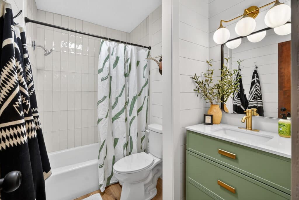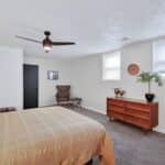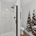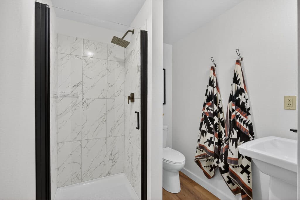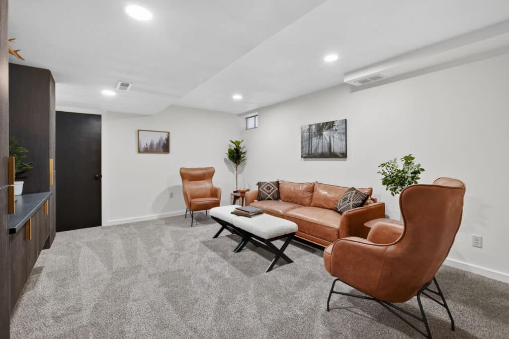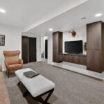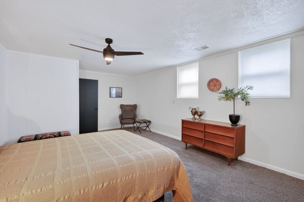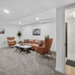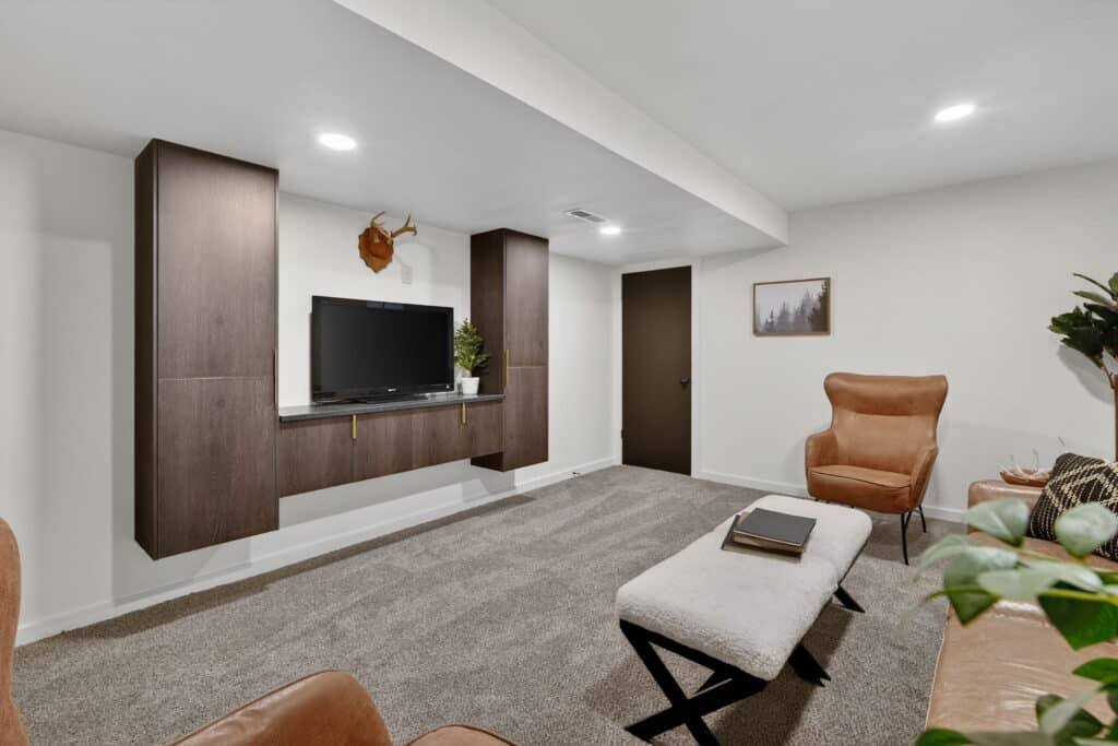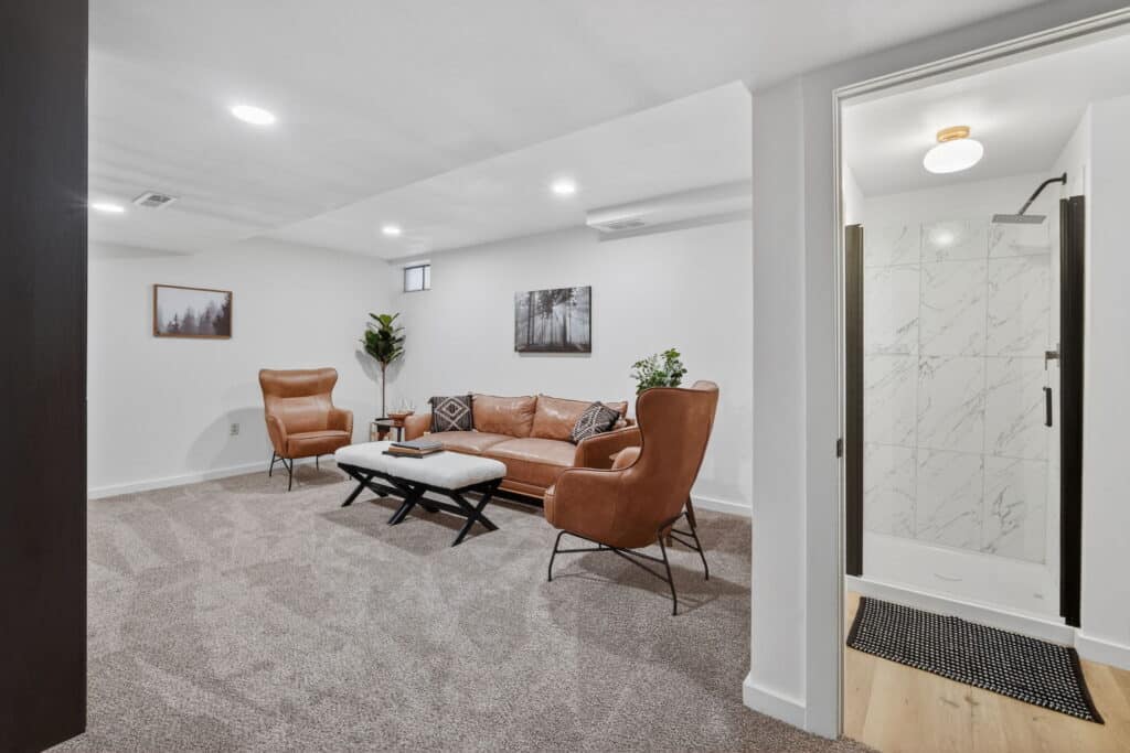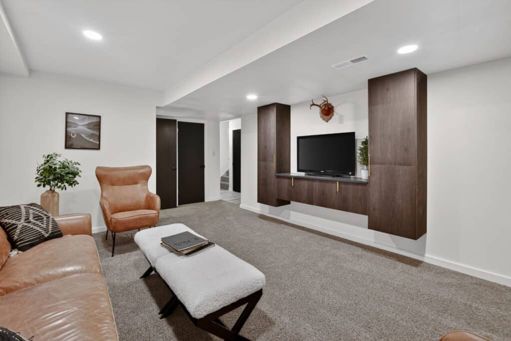 The main floor features a large primary bedroom with a half bath, two additional bedrooms, and a full hall bathroom. Downstairs, the lower level includes a cozy entertainment room with built-in cabinets, an additional bedroom, and a shower bath—ideal for guests or extra living space.